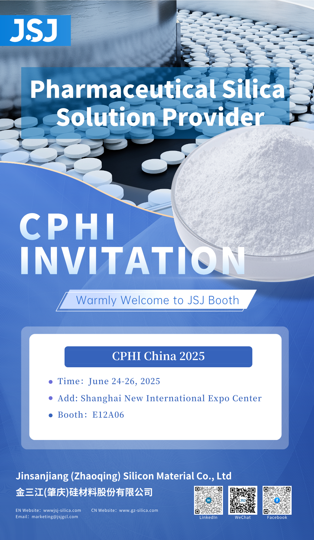At this event, JSJ will showcase its pharmaceutical silica solutions, presenting new achievements and practices in applications such as anti-caking, flow aid, moisture-proofing, and carrier technologies to guests and friends.