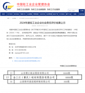 Jin Sanjiang was rated as “AAAA-level Social Responsibility Enterprise in Light Industry in 2024” in October and has recently passed the public announcement.